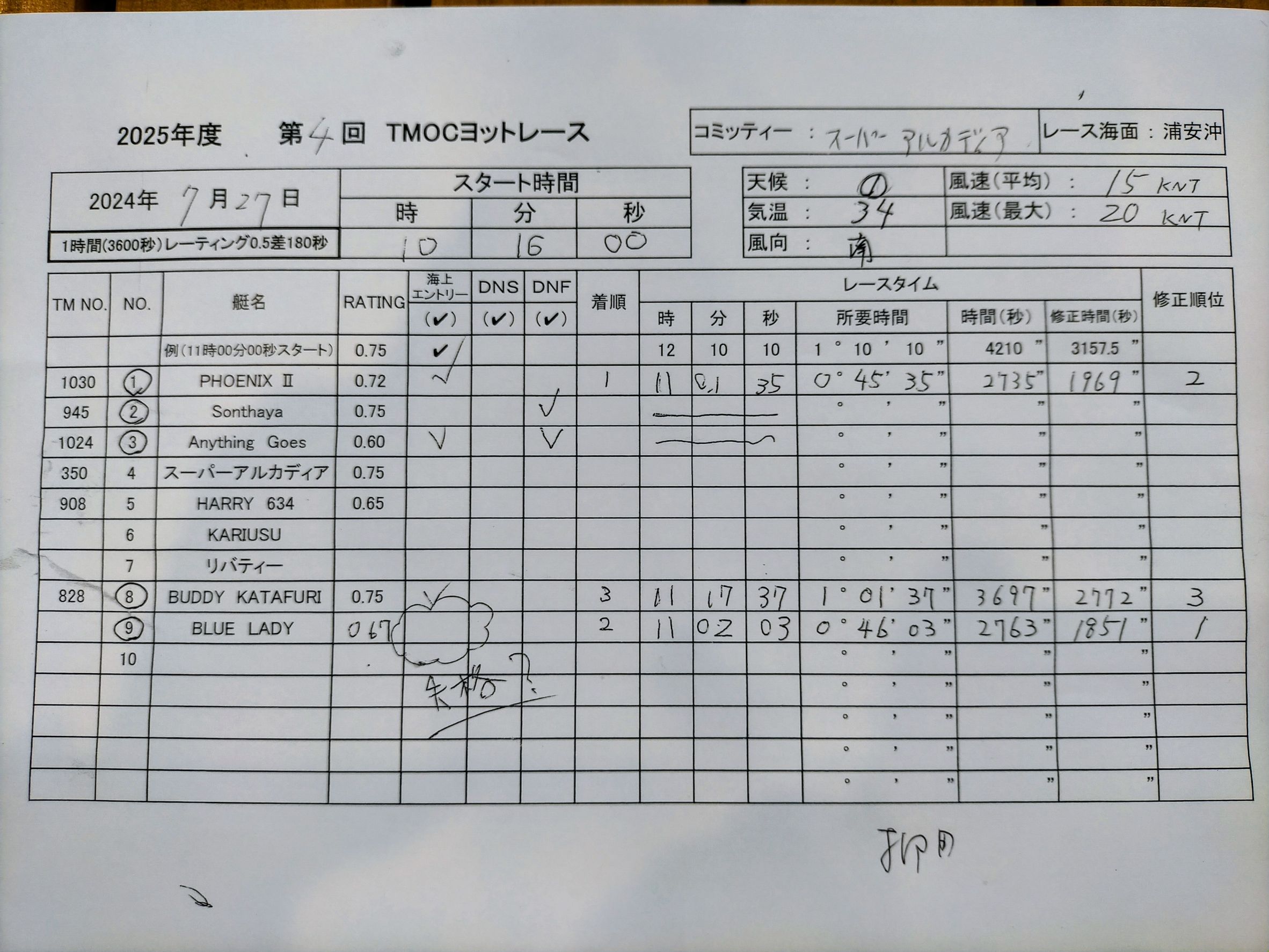 7月27日(日) | TMOCヨットレース 第4戦 | レース結果 | 優勝:BLUE LADY 2位:PHOENIXⅡ 3位:BUDDY KATAFURI |