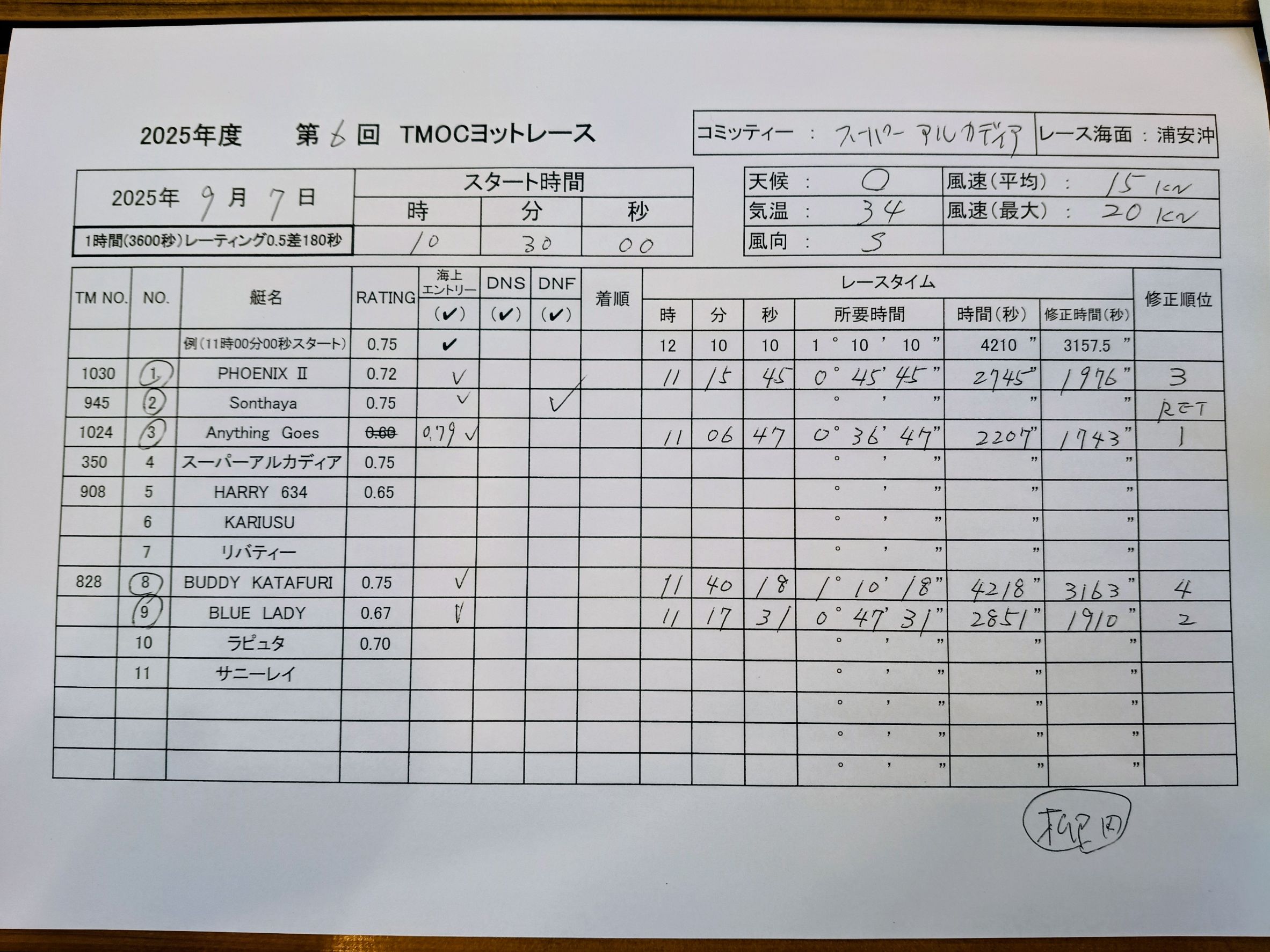 9月7日(日) | TMOCヨットレース 第6戦 | レース結果 | 優勝:Anything Gose 2位:BLUE LADY 3位:PHOENIXⅡ 4位:BUDDY KATAFURI |