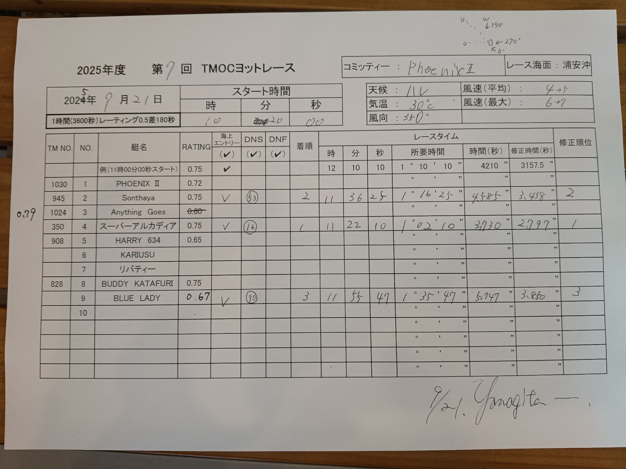 9月21日(日) | TMOCヨットレース 第7戦 | レース結果 | 優勝:スーパーアルカディア 2位:Sonthaya 3位:BLUE LADY |