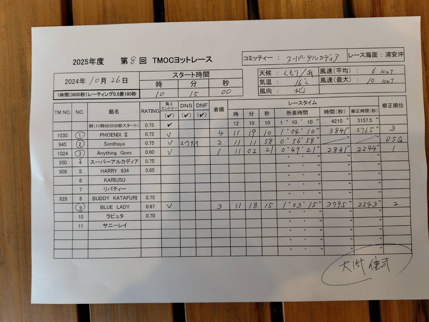 | 10月26日(日) | TMOCヨットレース 第8戦 | レース結果 | 優勝:Anything Goes 2位:BLUE LADY 3位:PHOENIXⅡ |